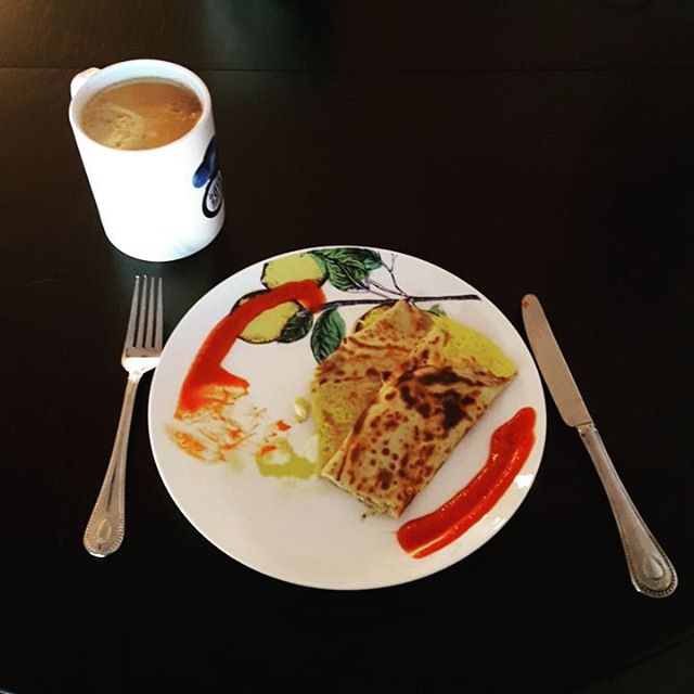 The perfect crepe breakfast with Gruyère cheese and Sriracha sauce and coffee