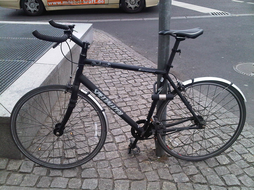 Here's my Specialized Langster Gangster single speed bike locked at a pole with the biggest, stoutest, U-lock I could buy. I wasn't that worries about stolen wheels as it didn't have quick release hubs or a quick release on the saddle. So, I would just secure the frame. |